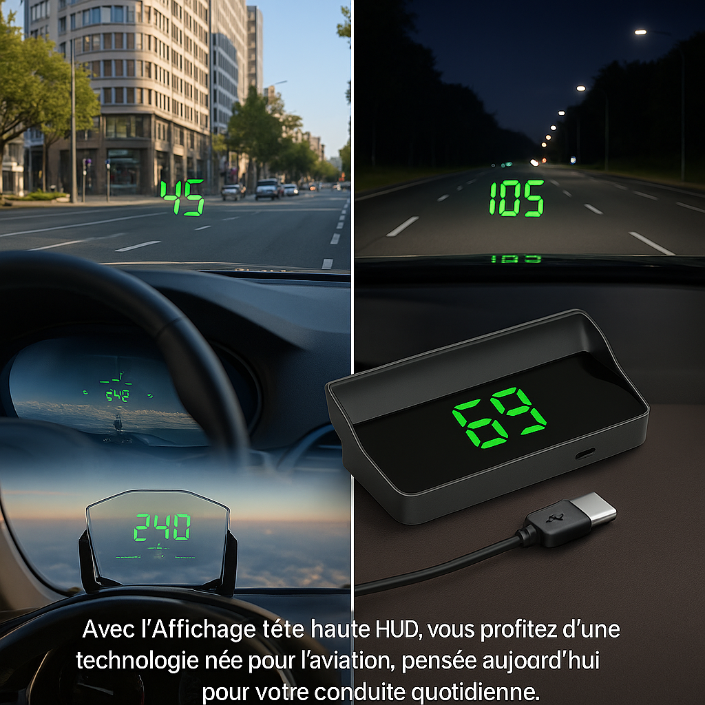 Aujourd’hui, le HUD s’est démocratisé : plus besoin d’un pare-brise spécial ni d’une installation complexe. Notre Affichage tête haute HUD reprend l’essence de cette innovation aéronautique et la rend accessible à tous les véhicules grâce à une alimentation USB 5 V et une mise en route Plug & Play.